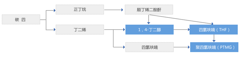 出发原料为丁二烯或正丁烷,经1,4-丁二醇生产THF及PTMEG